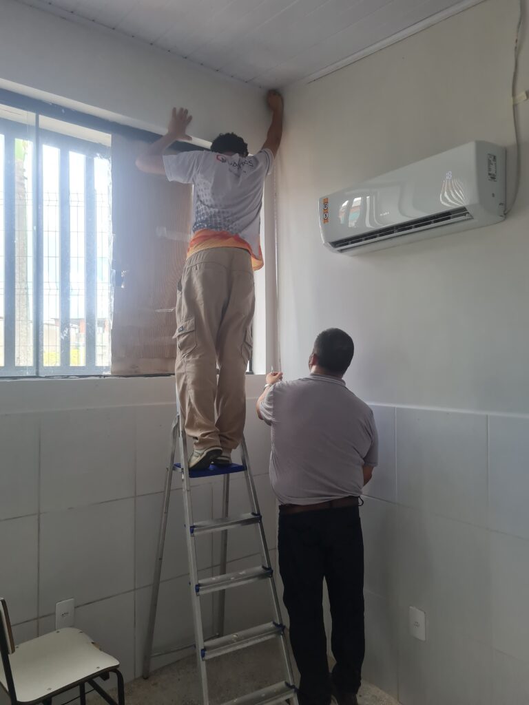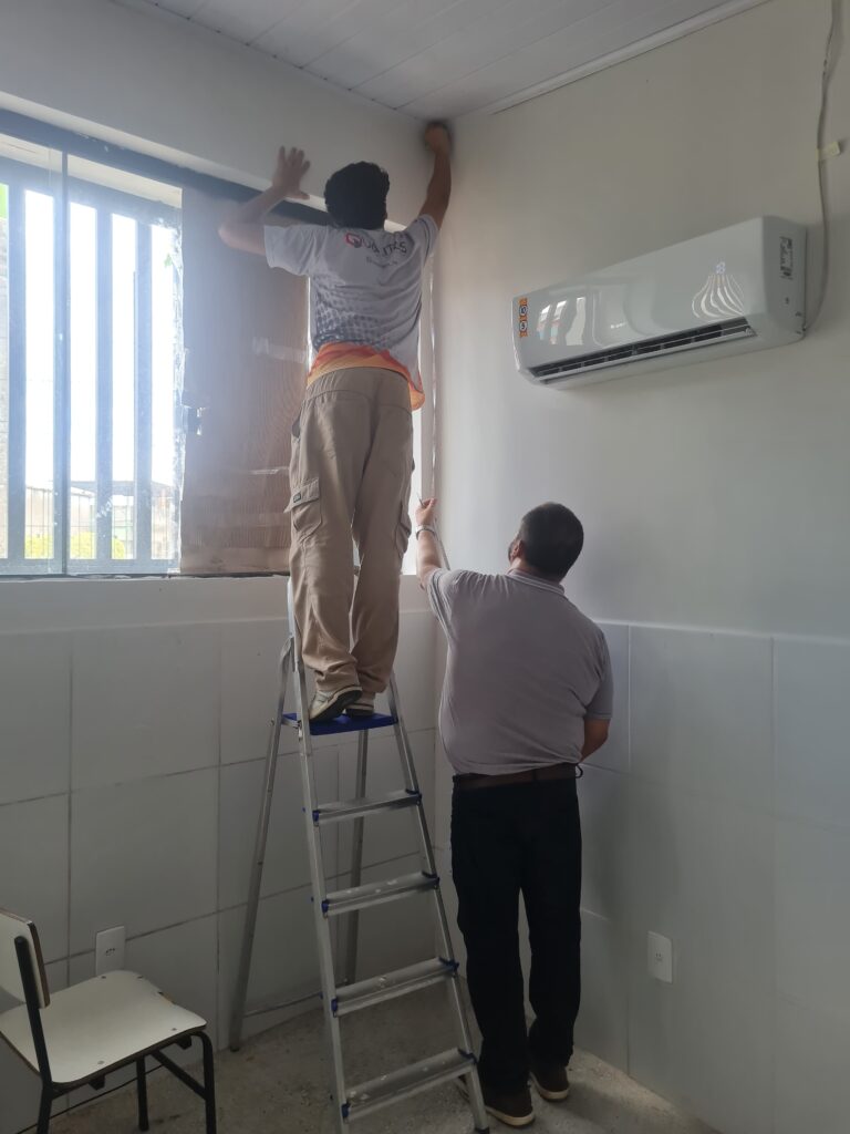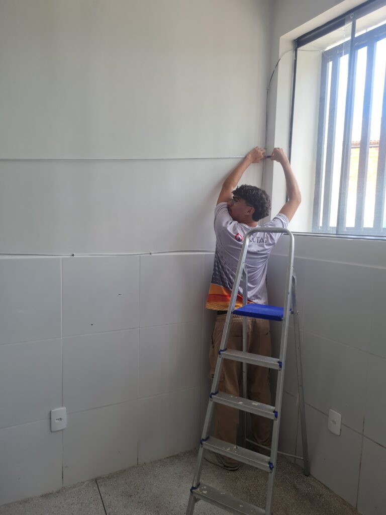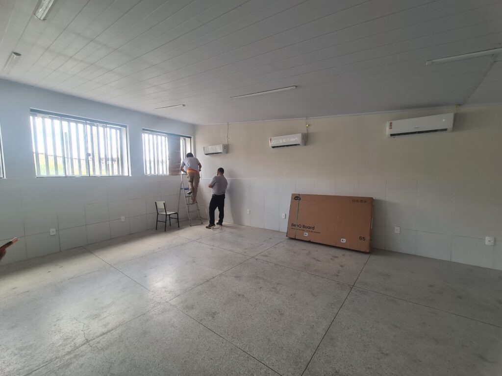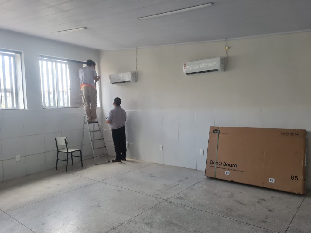 Durante a vistoria, foi realizado medições, avaliado os pontos de energia e rede e as necessidades para implementação, como: listar as necessidades de cada unidade. Estas serão equacionadas pela SEDUC.
